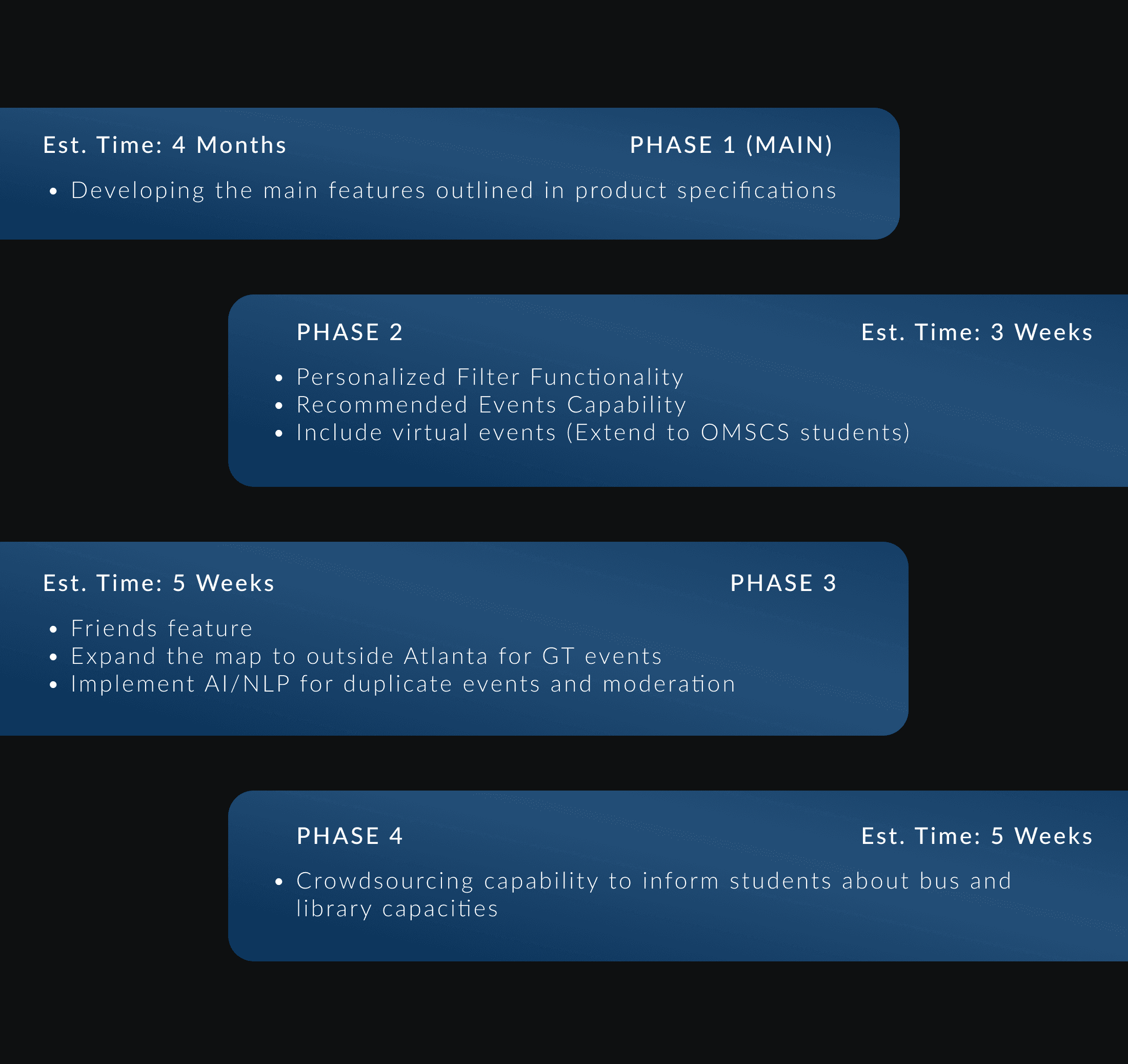 We proposed to launch the entire feature set of the app over four iterative phases with the product specifications for each phase outlined below.