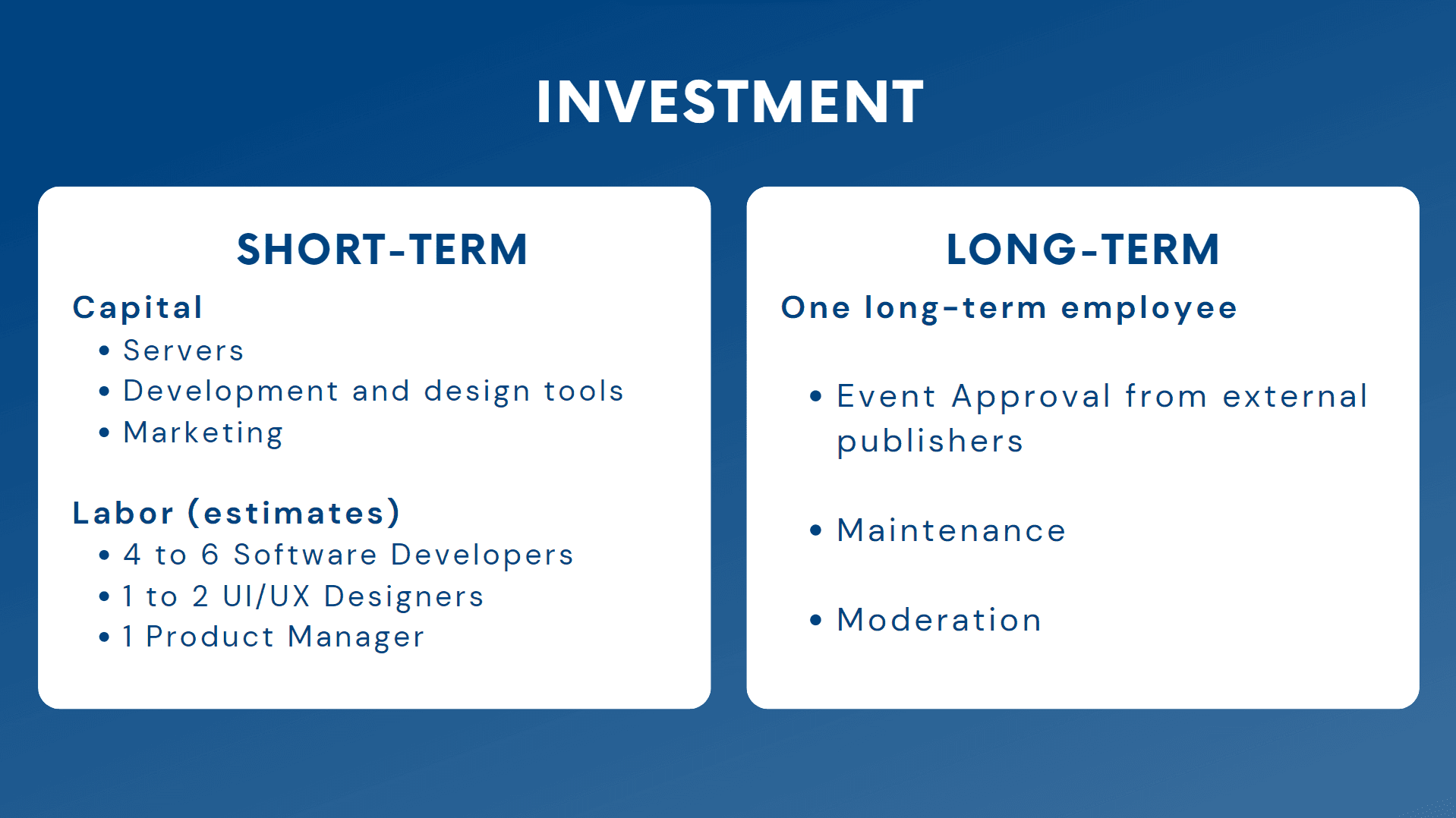 The product specifications, scale of the product, skills required and marketing considerations guided the short-term and long-term investment estimates.