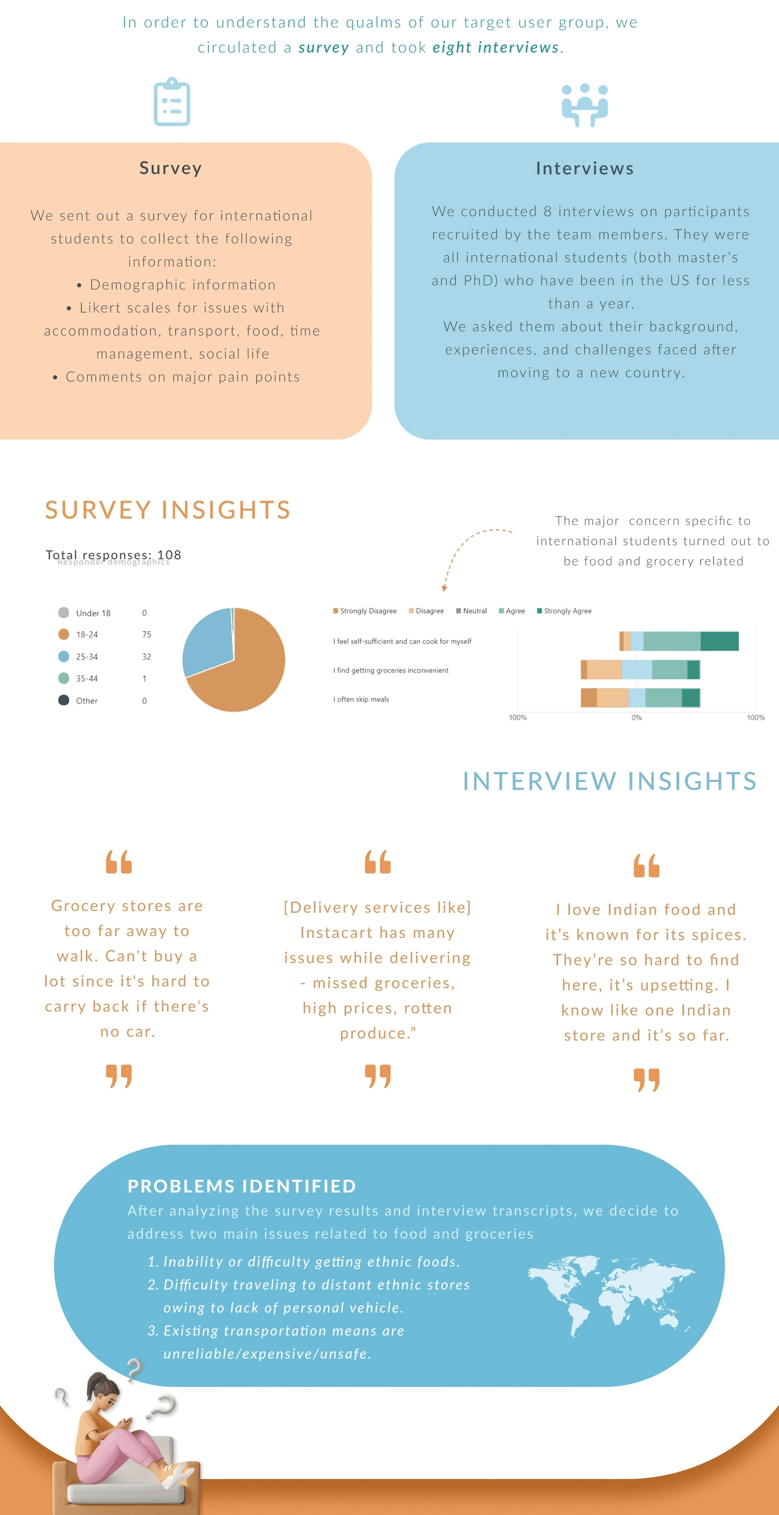 Mixed Methods Research: At the requirements gathering phase, I designed a survey and analyzed the responses to gauge the most prominent issues faced by international students in the US.