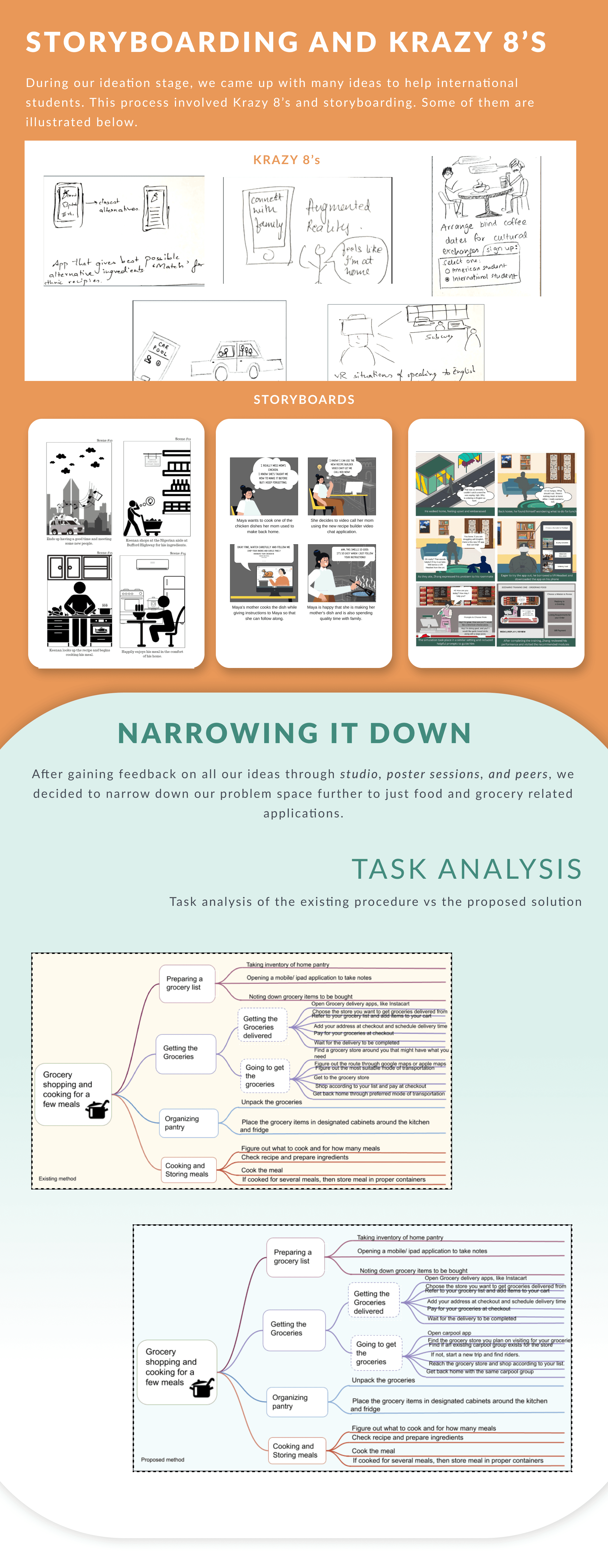 Ideation: I drew up user personas, user stories and scenarios, 3 storyboards, task analysis and Krazy 8s to get started on a solution.
