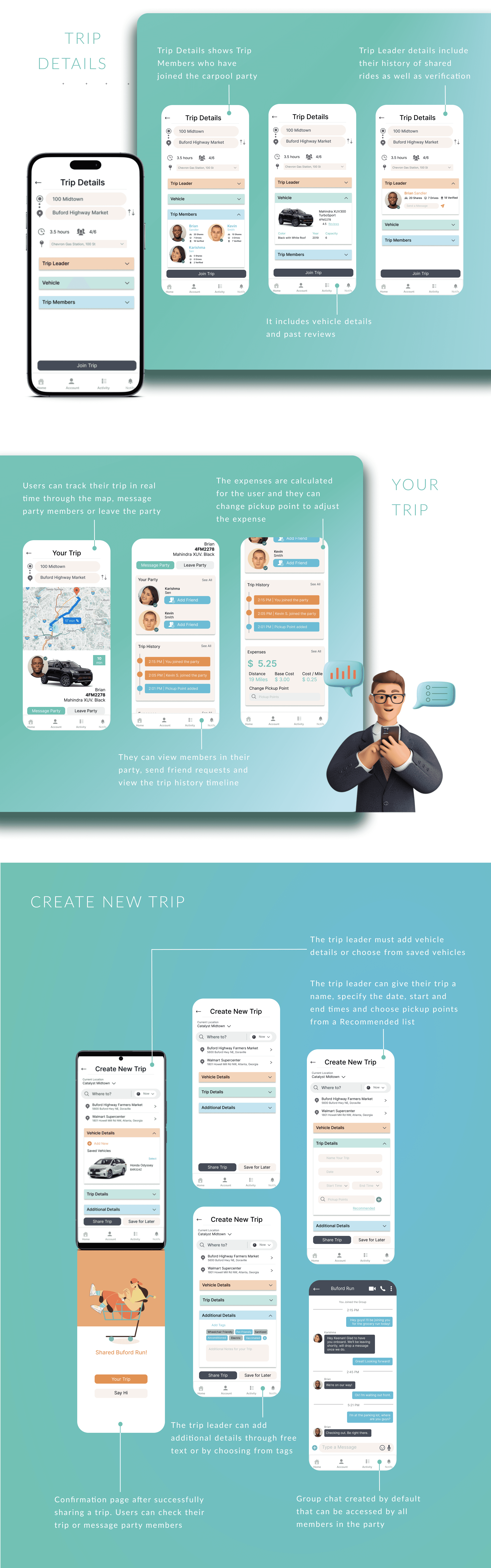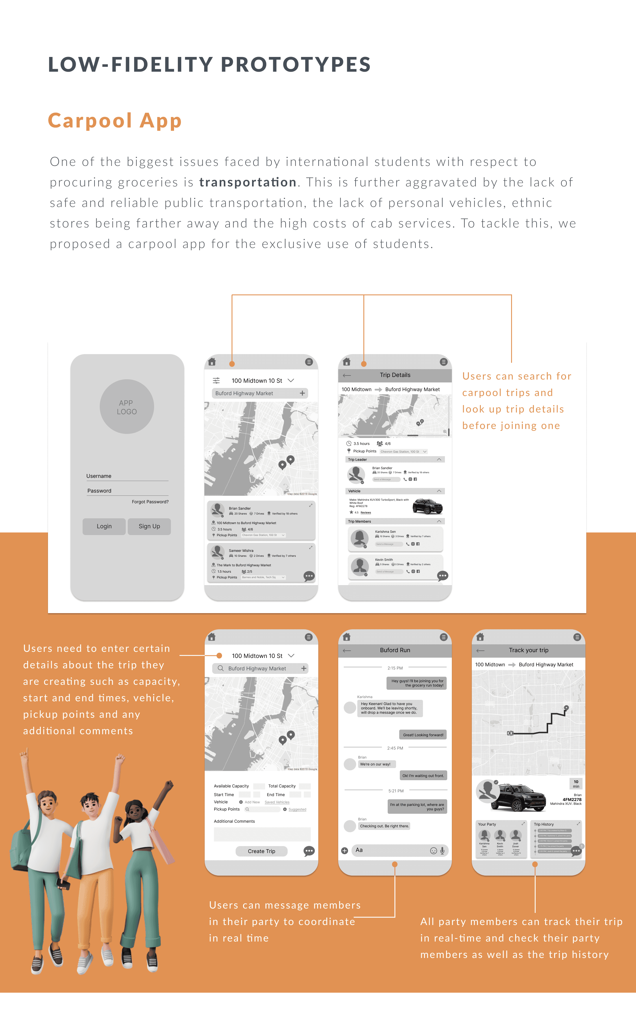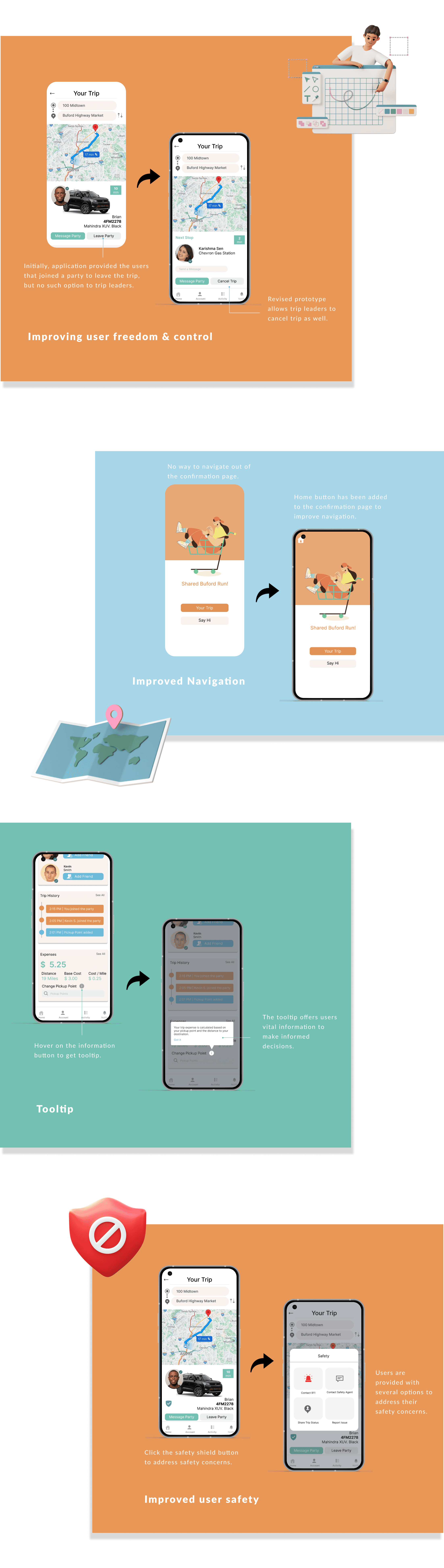 Wireframing/Prototyping: I worked on the wireframes and high-fidelity prototype for the carpool part of the app.