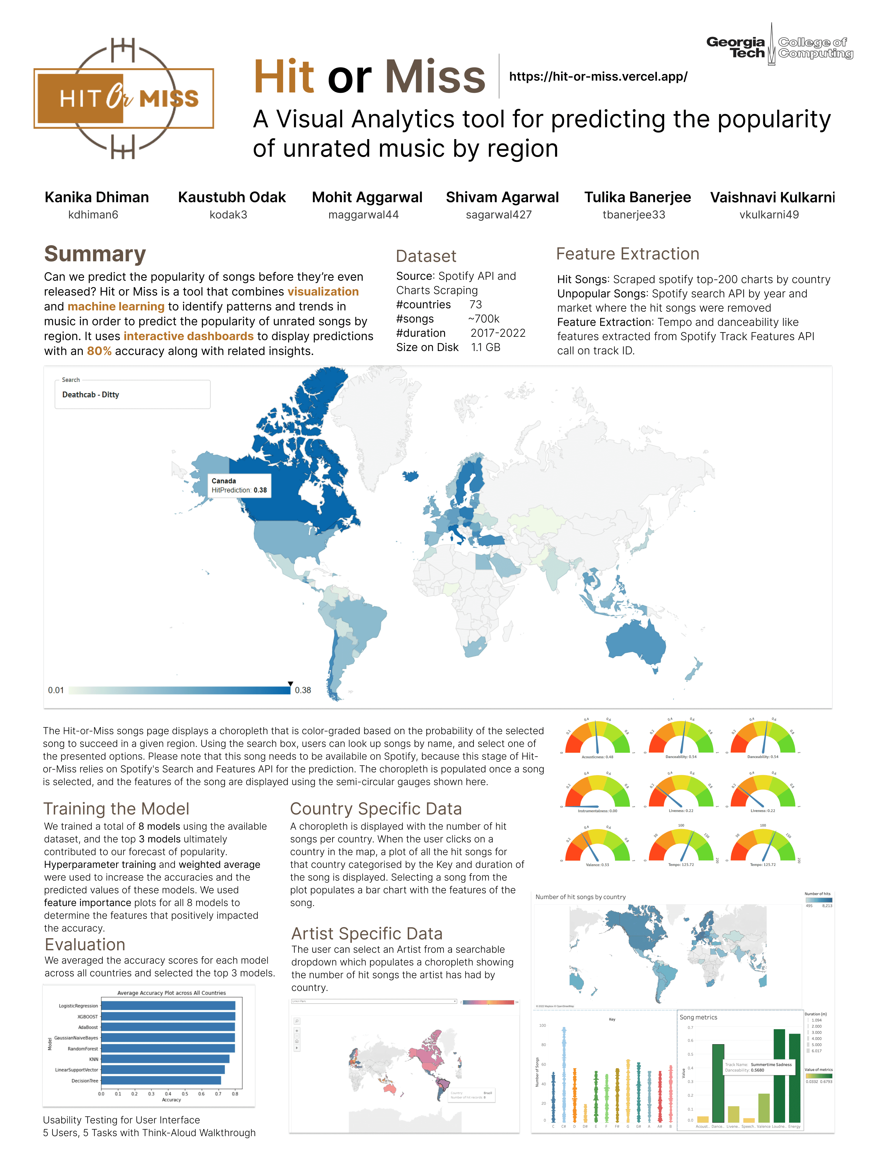 Can we predict the popularity of songs before they’re even released? Hit or Miss is a tool that combines visualization and machine learning to identify patterns and trends in music in order to predict the popularity of unrated songs by region. It uses interactive dashboards to display predictions with an 80% accuracy along with related insights.