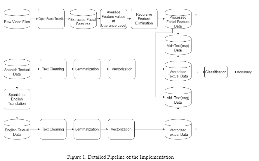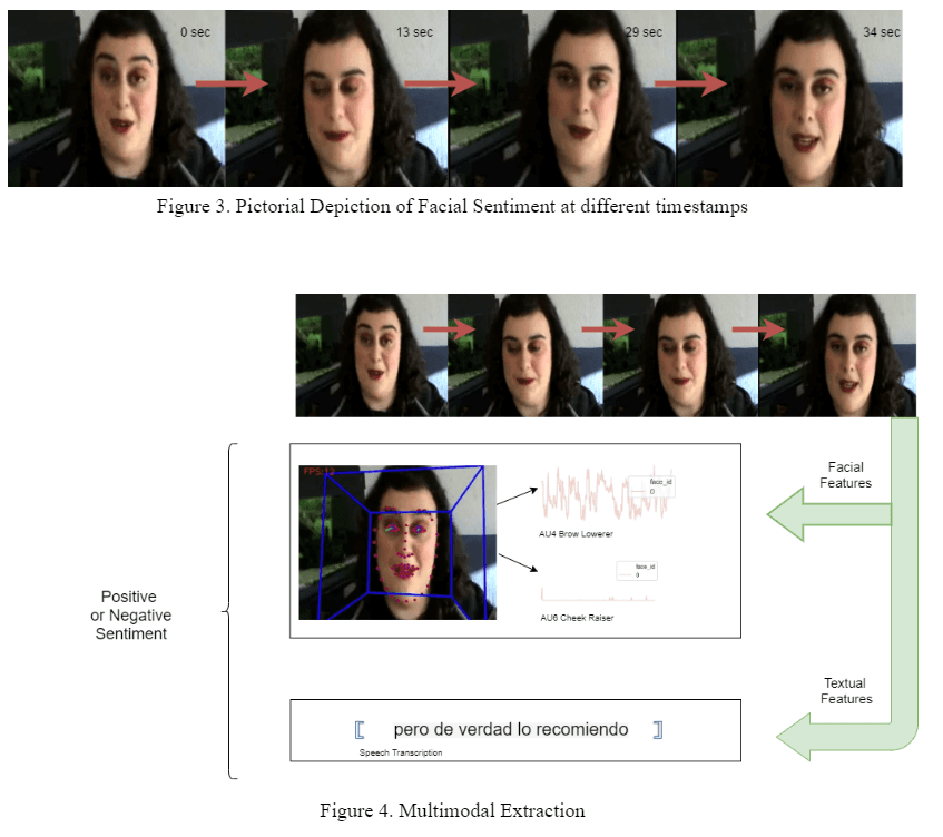 The paper works with a dataset of Spanish video reviews. The audio is available as Spanish text and is translated to English while visual features are extracted from the videos. Multiple classification models are made to analyze the sentiments at each modal stage i.e. for the Spanish and English textual datasets as well as the datasets obtained upon coalescing the English and Spanish textual data with the corresponding visual cues.