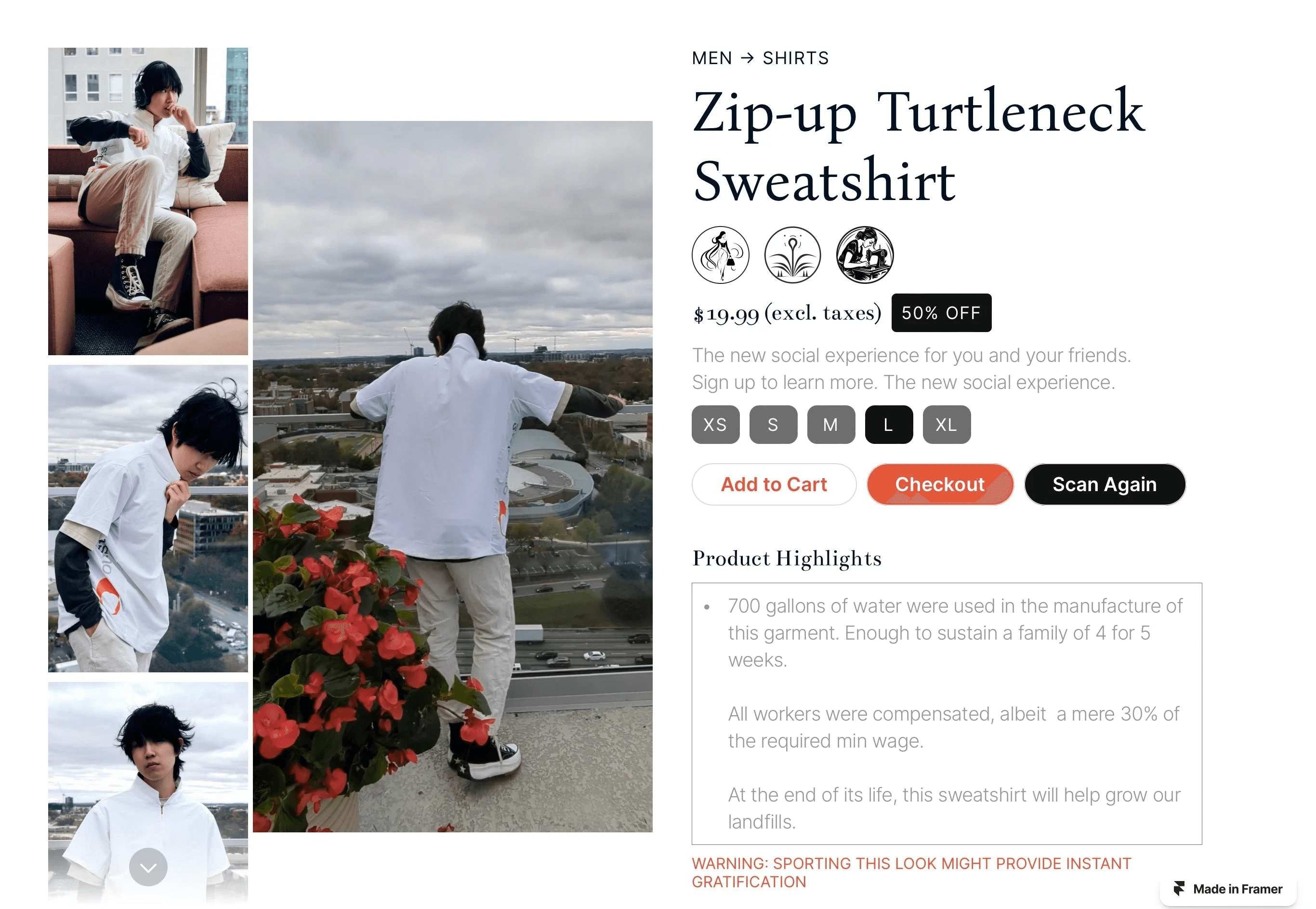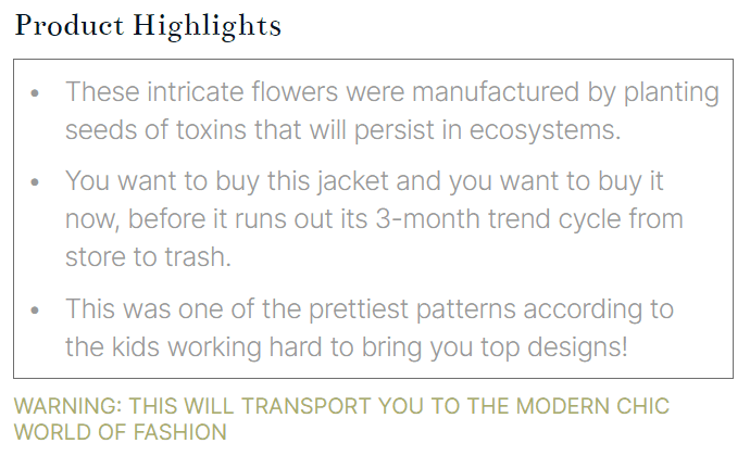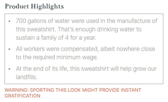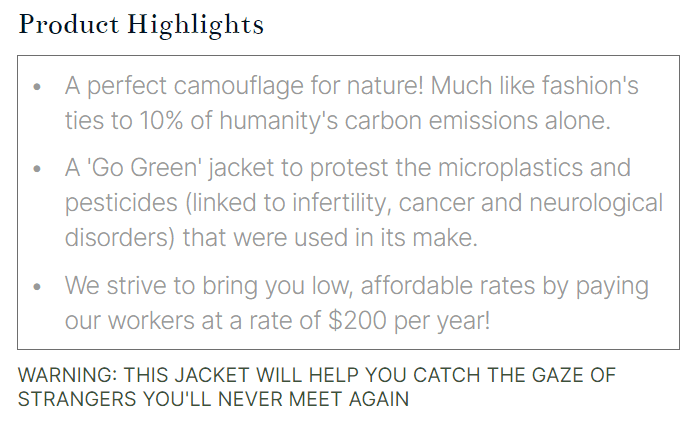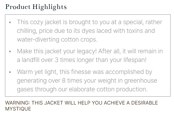 UX Writing: I worked on the copywriting for the website (Product Details and Warning), carefully curated to best represent the facts while preserving the shock value and satire.